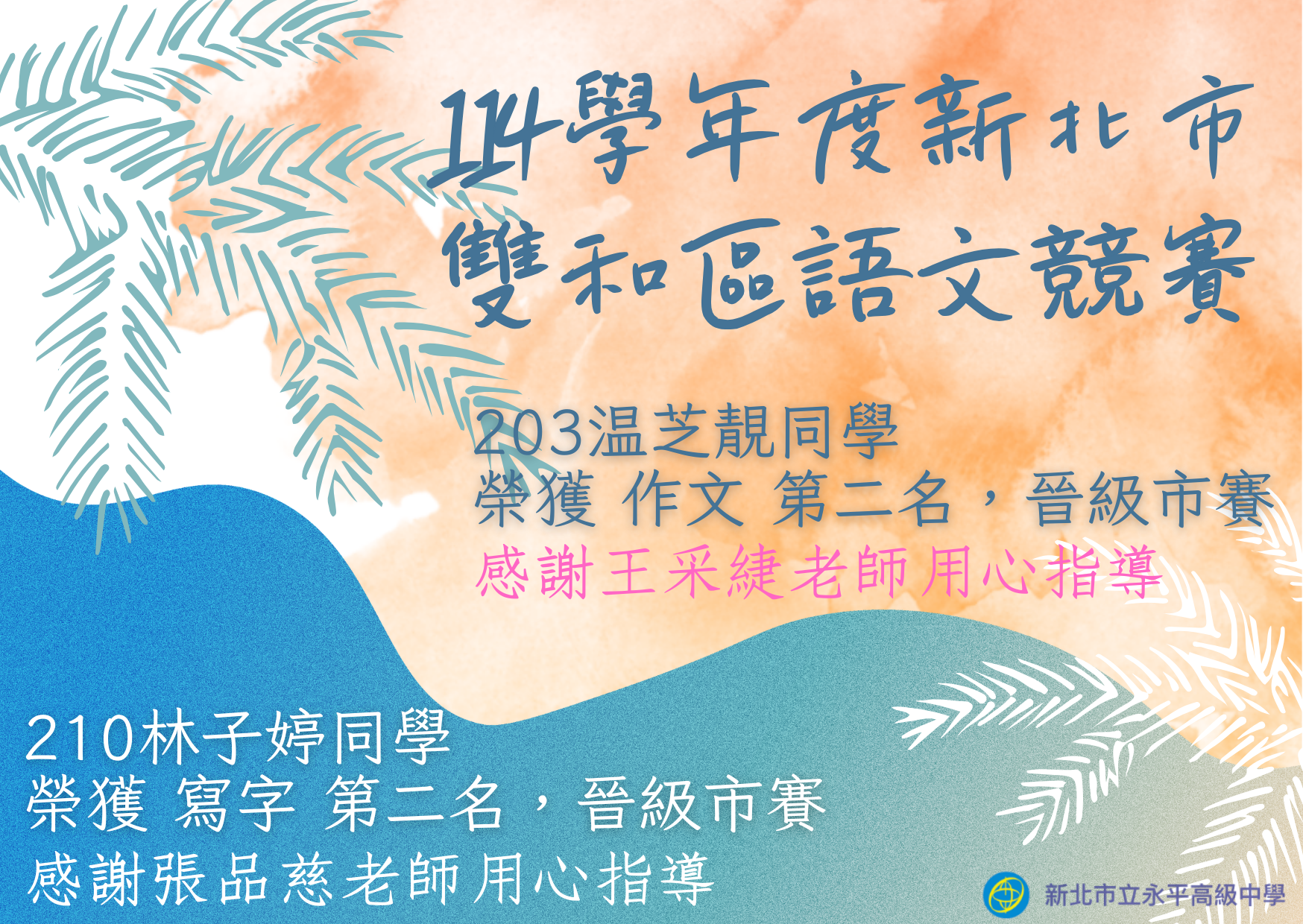 114學年度新北市雙和區語文競賽|温芝靚榮獲高中組作文第二名、林子婷榮獲高中組寫字第二名
