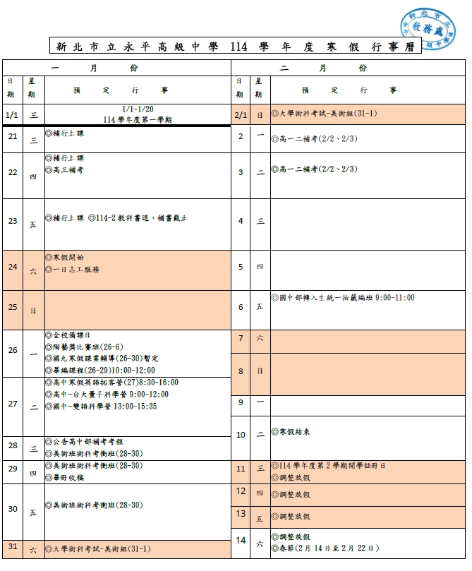 公告新北市立永平高級中學114學年度第一學期寒假行事曆