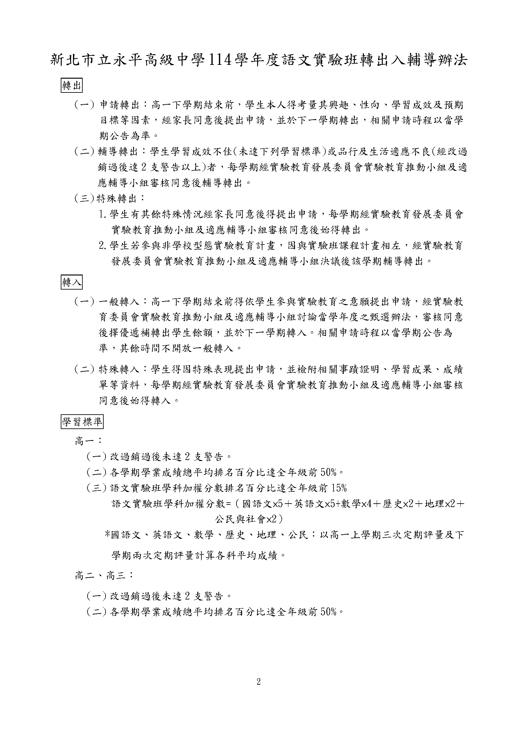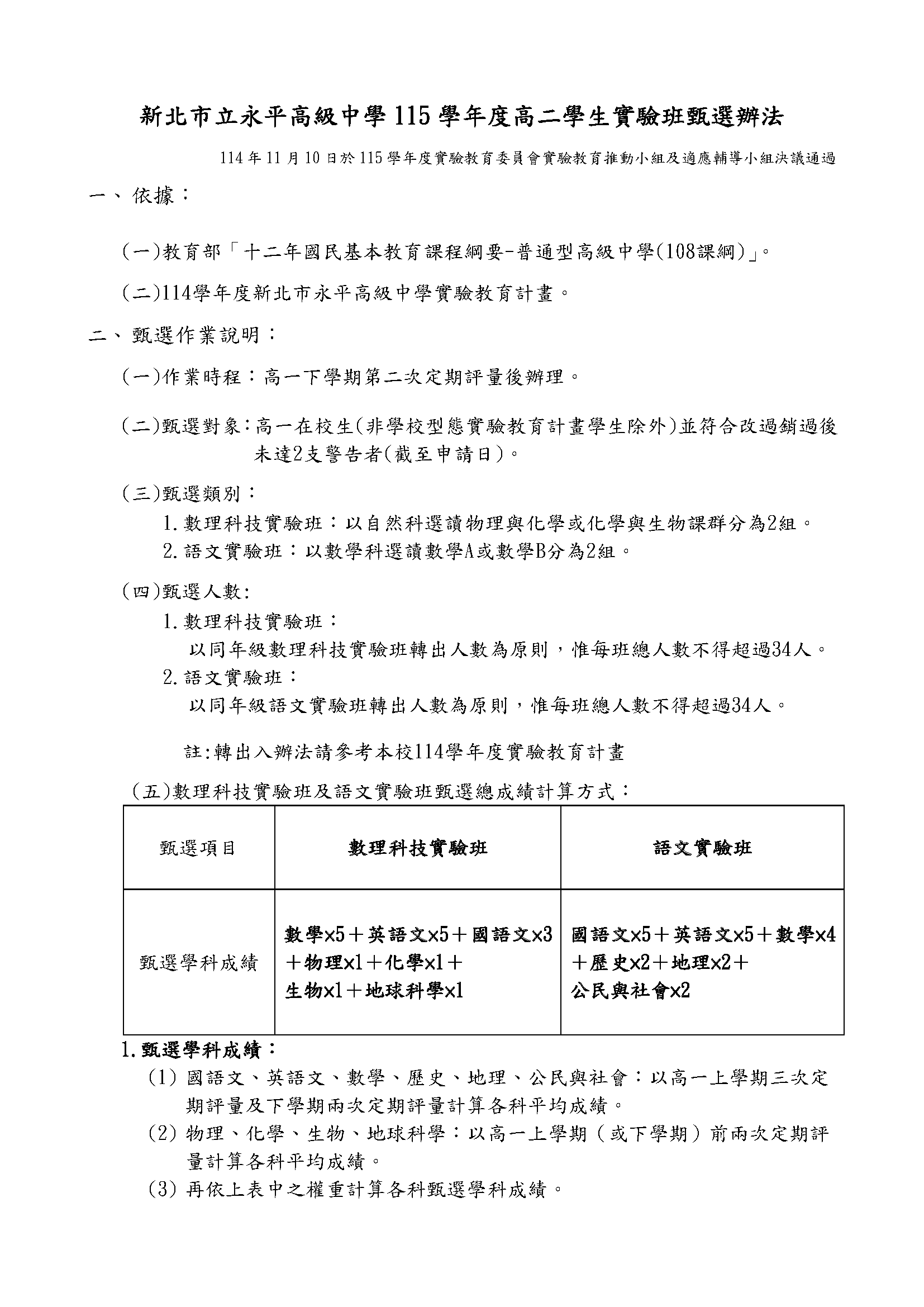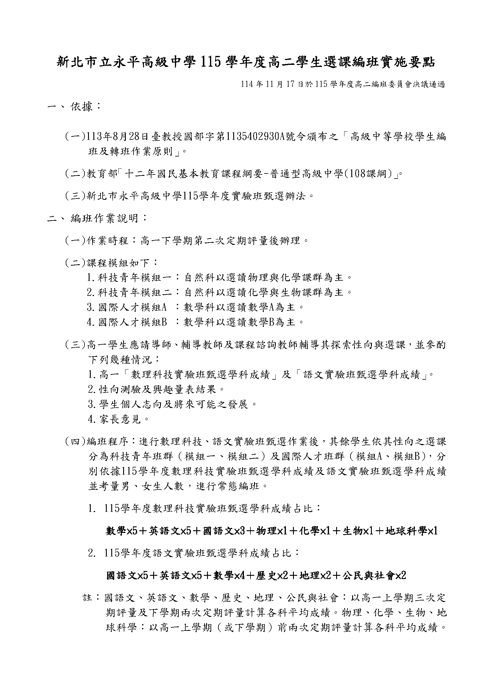 新北市立永平高中115學年度高二學生選課編班實施要點;115學年度高二學生數理科技、語文實驗班甄選辦法;新北市立永平高級中學114學年度數理科技、語文實驗班轉出入輔導辦法
