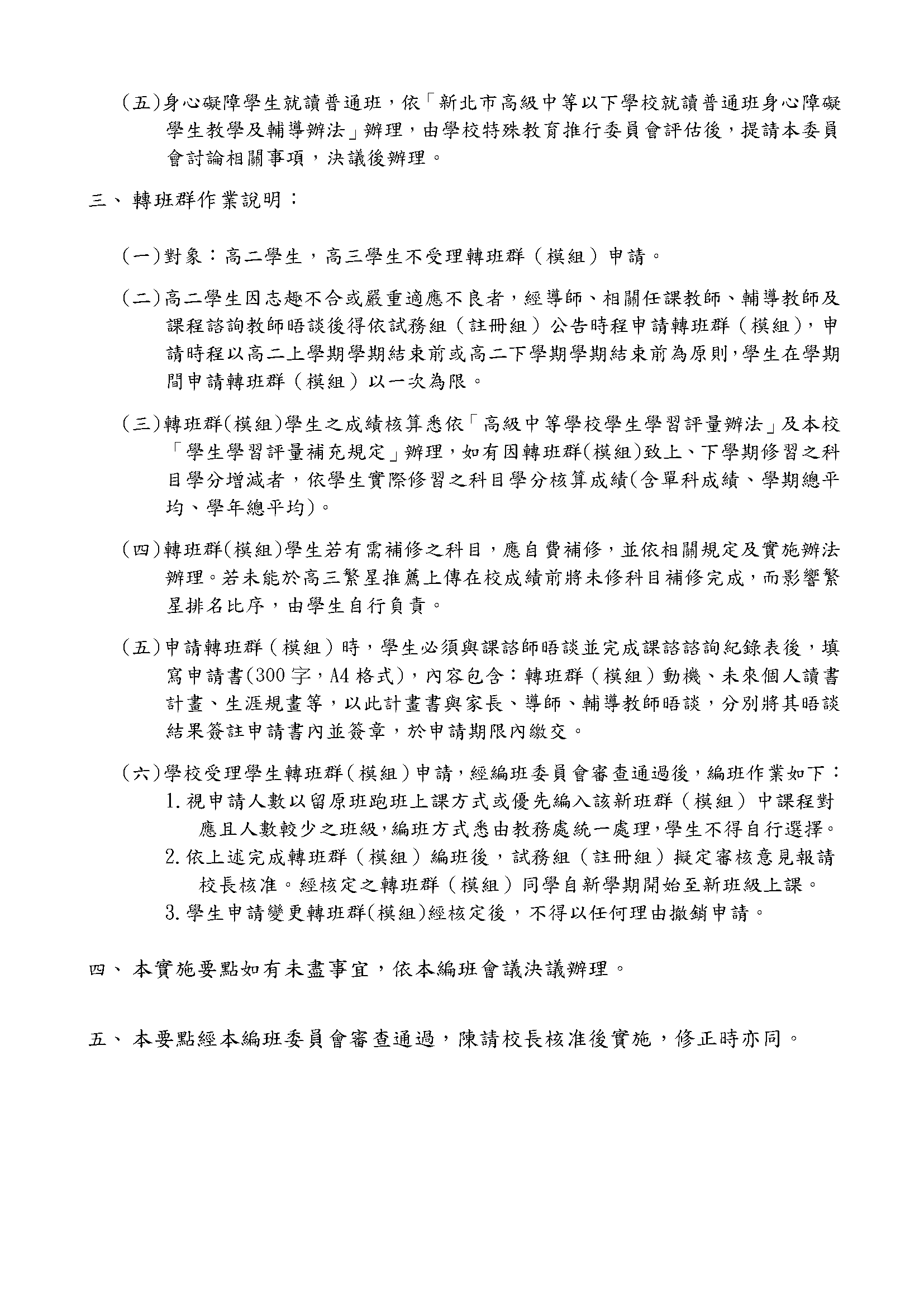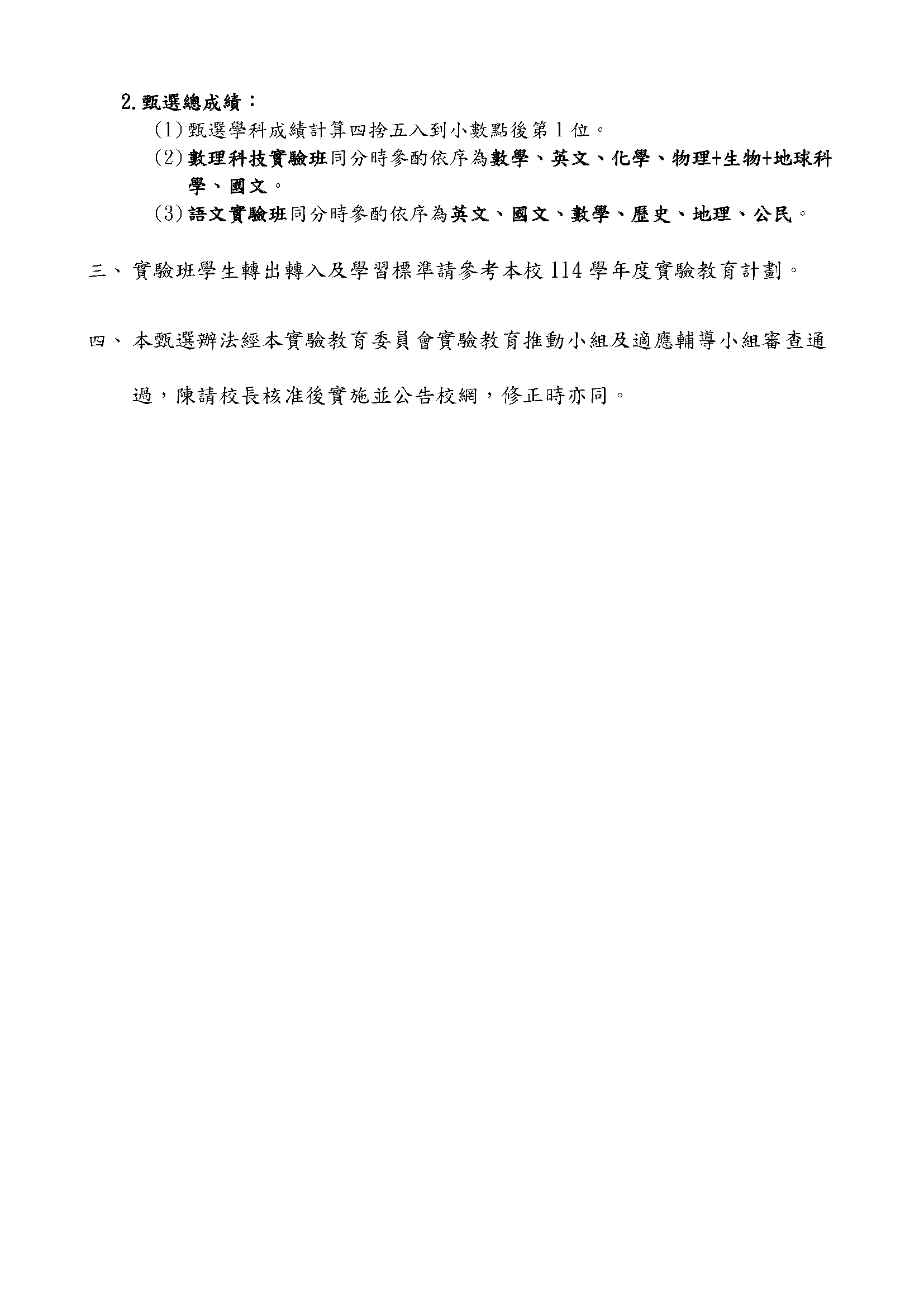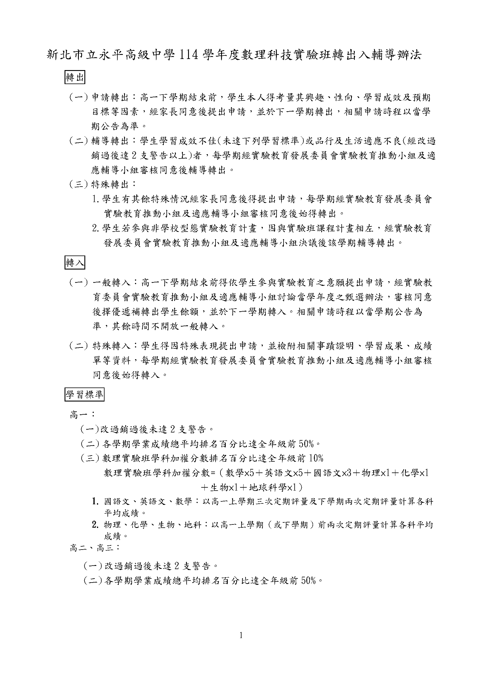 新北市立永平高中115學年度高二學生選課編班實施要點;115學年度高二學生數理科技、語文實驗班甄選辦法;新北市立永平高級中學114學年度數理科技、語文實驗班轉出入輔導辦法